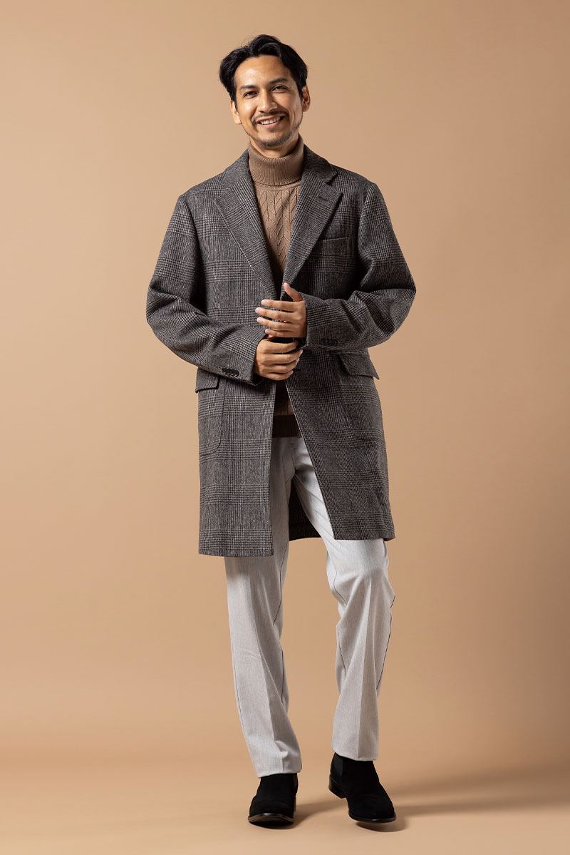 - テーラードジャケットのような端正な佇まいと、ロング丈のスマートなシルエットが魅力のチェスターコート。クラシックで洗練された大人の定番コートです。