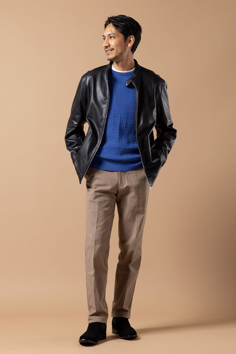 - 大人の品格を備えたライダーズブルゾンです。リアルレザーのような質感ながら、軽やかで扱いやすく、気負わず羽織れるのも魅力の一つ。